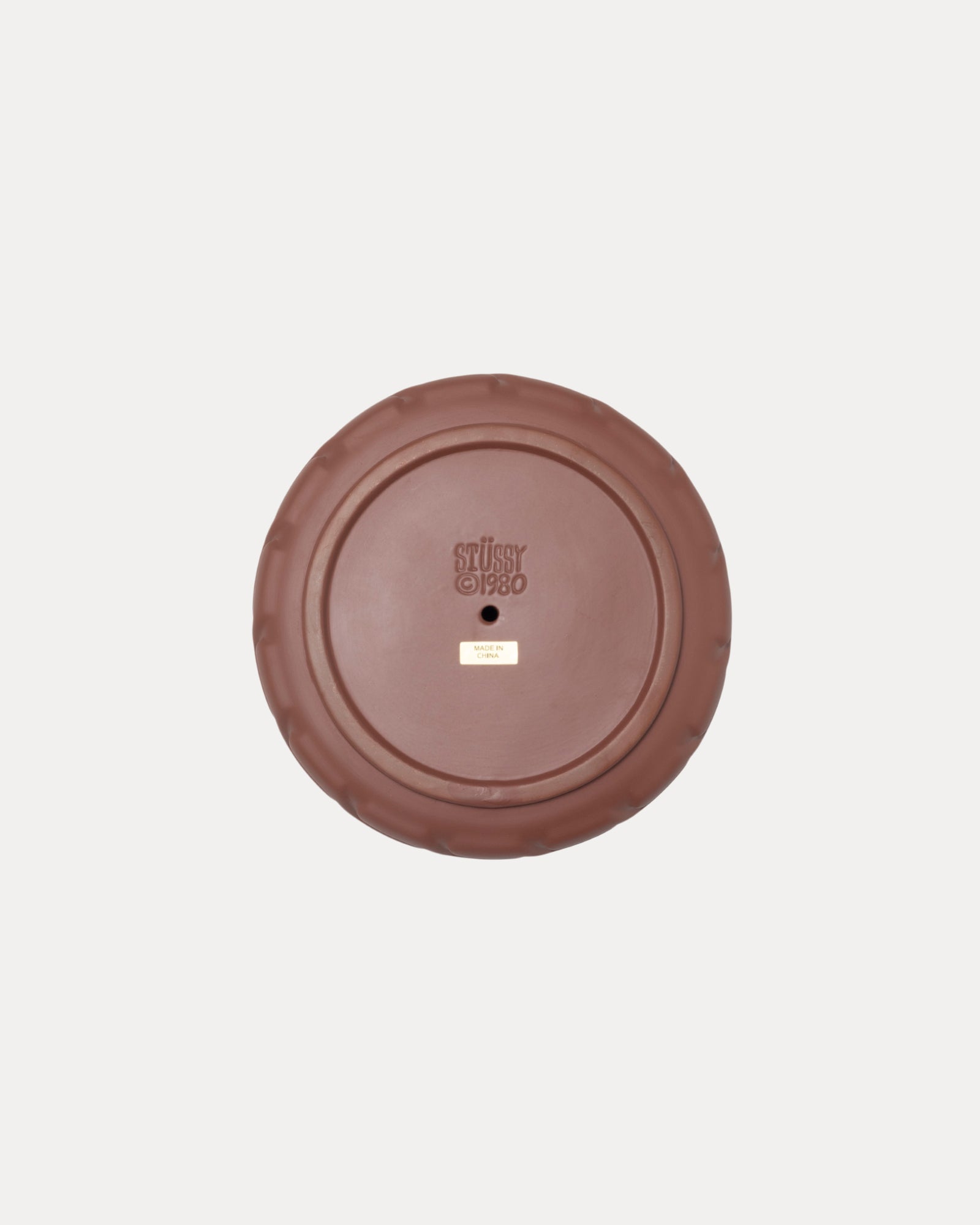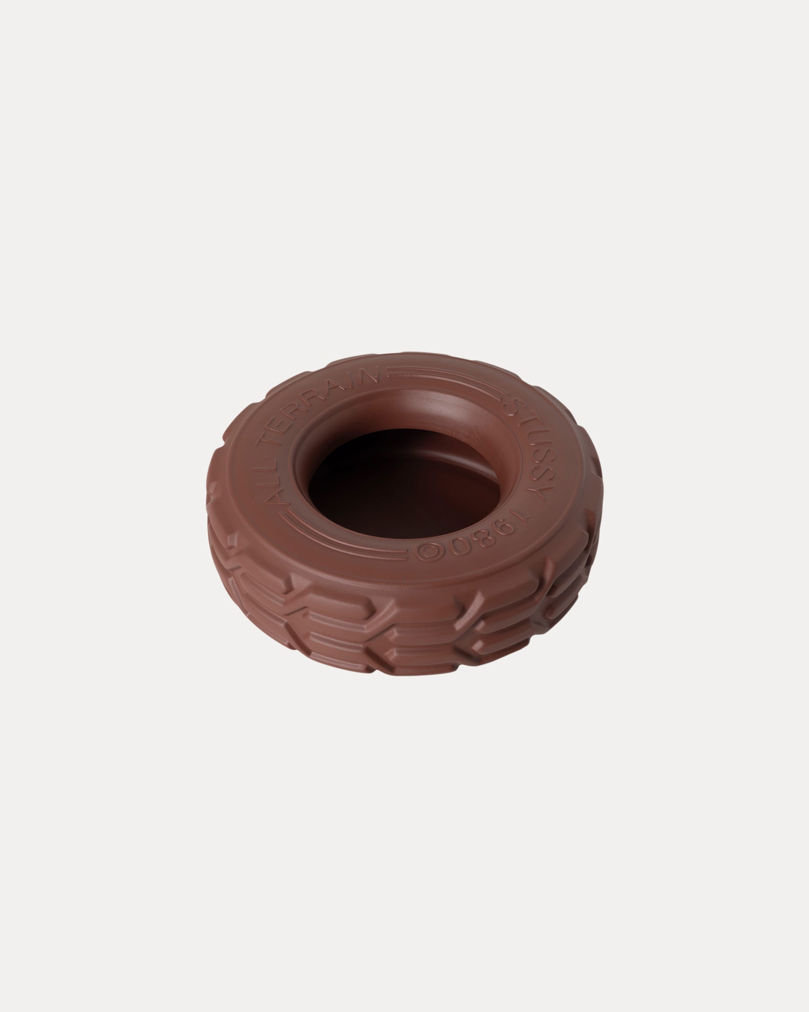 Tire-shaped plant pot in matte terracotta ceramic. St??ssy all terrain embossing at top edge.