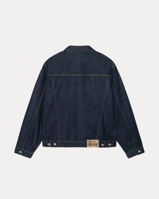 Relaxed fit trucker jacket in 14.5oz rinsed indigo denim. Boxy cut with branded nickel shank hardware. gold topstitching and a suede Stüssy logo patch.
