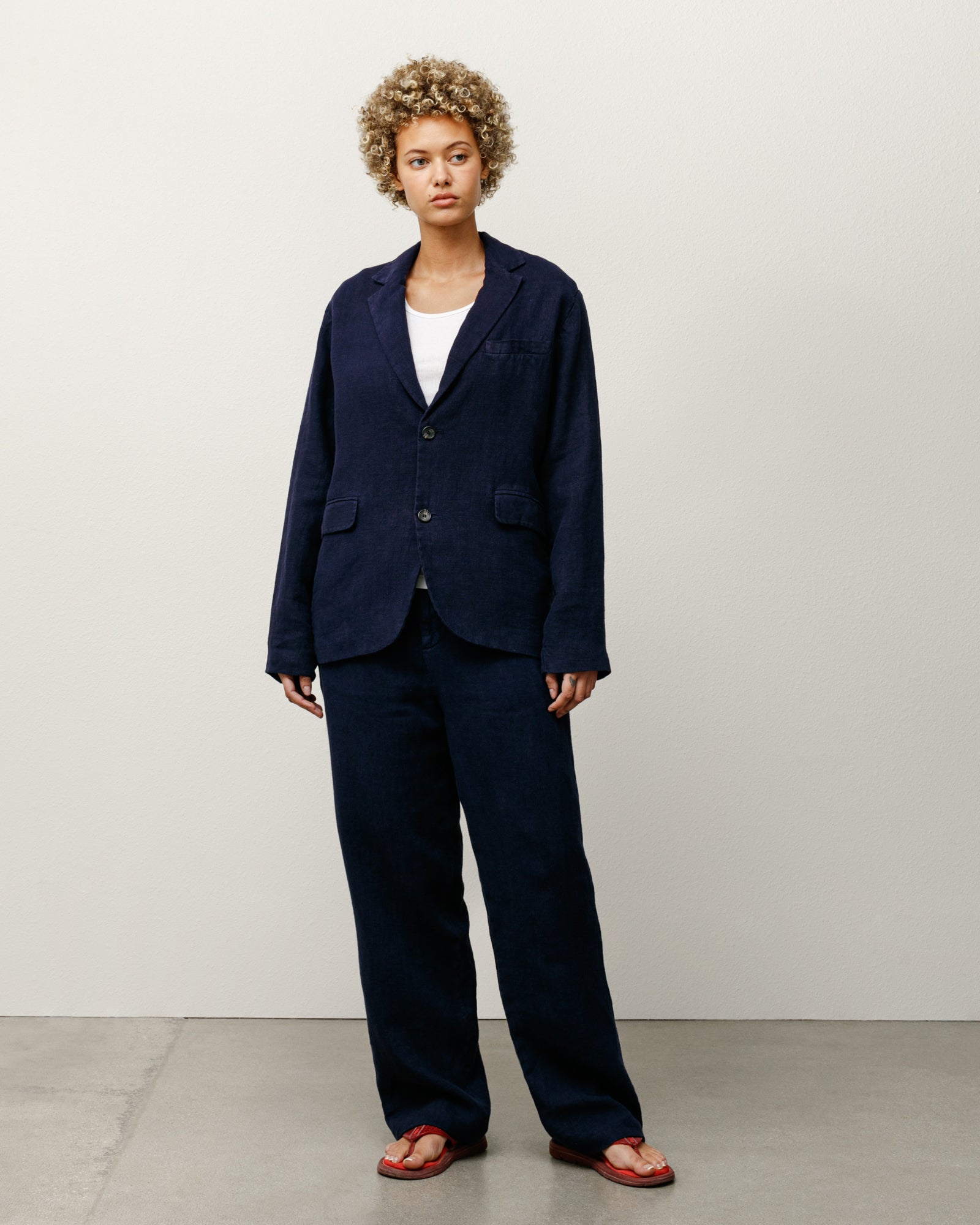 Relaxed fit blazer in textured linen with cotton lining. Features a two horn button closure and unstructured shoulders.