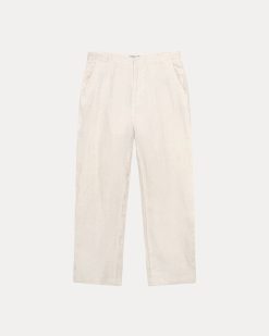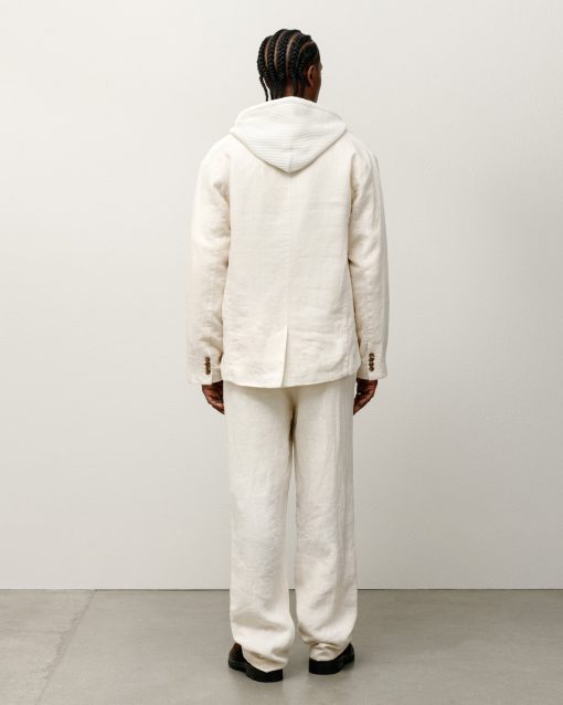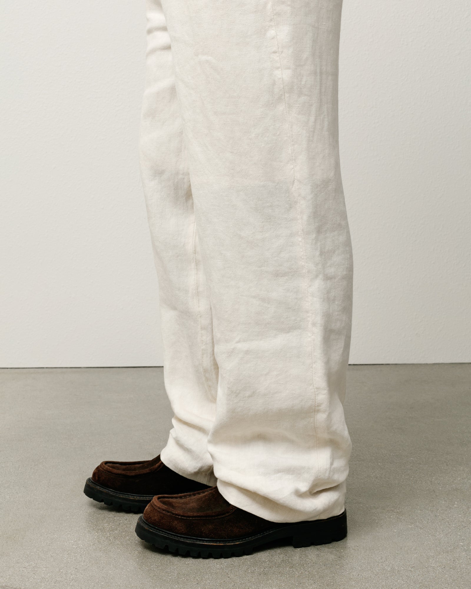 Relaxed fit trouser in textured linen. half lined in cotton. Features a hook and bar closure. angled side pockets and rear welt pockets.