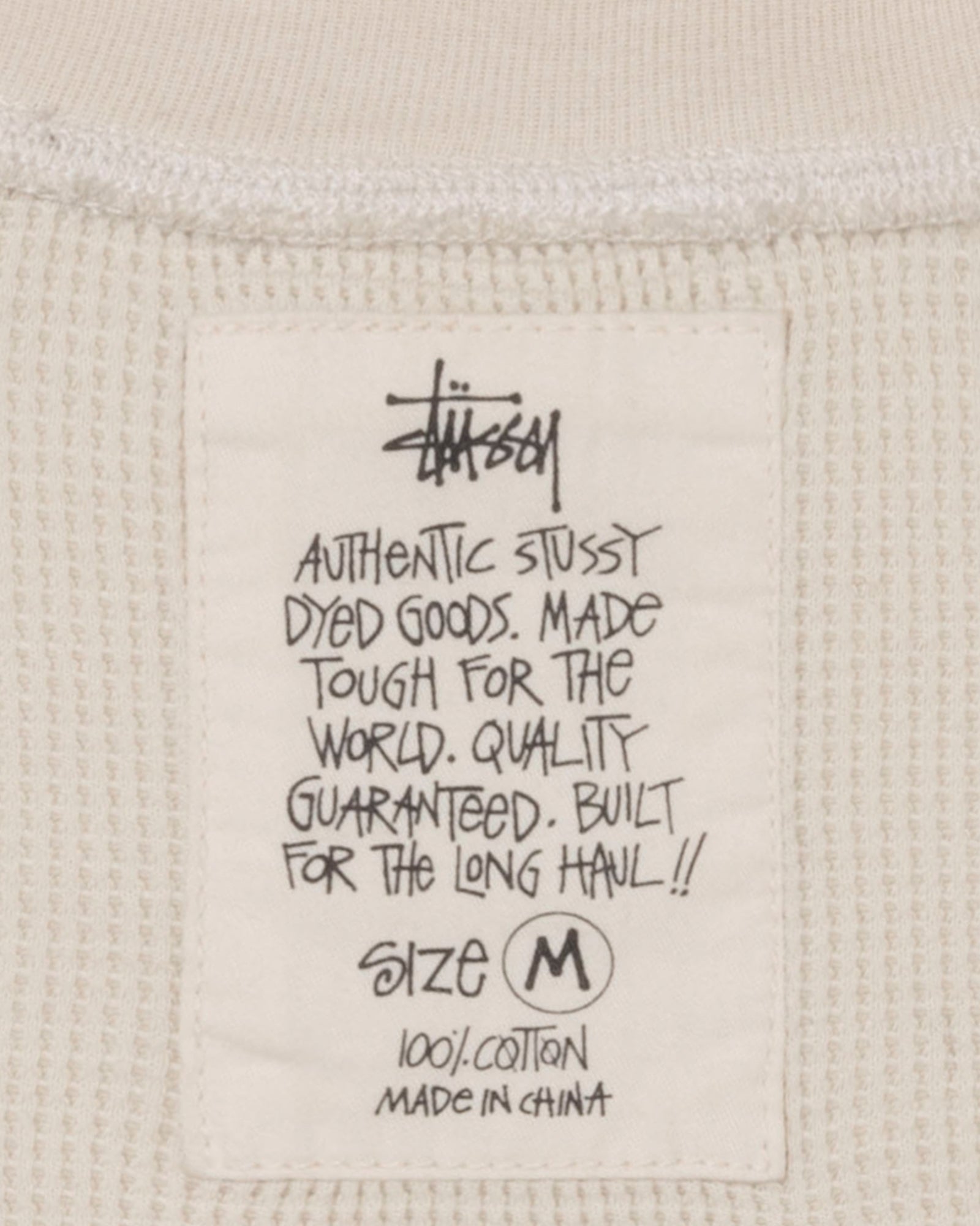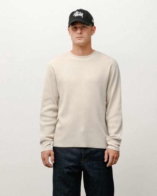 Classic fit waffle knit thermal in stonewashed pigment dyed cotton. Features a ribbed crewneck and cuffs. flatlock stitching. and cotton Stüssy label sewn inside.